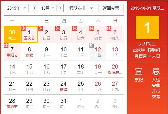10月1日(星期二)至10月7日(星期一)放假,共7天。10月8日(星期二)上班。