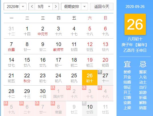 放假時(shí)間:2020年10月1日至10月8日放假,共8天。9月27日(星期日)上班。
