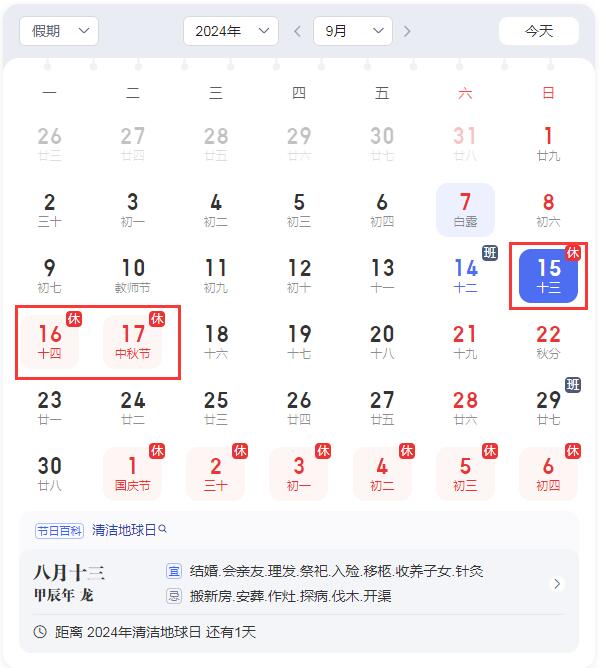 2024年中秋節(jié)放假時間安排: 9月15日(星期日)至7月17日(星期二)放假調(diào)休,共三天。9月18日(星期三)上班。